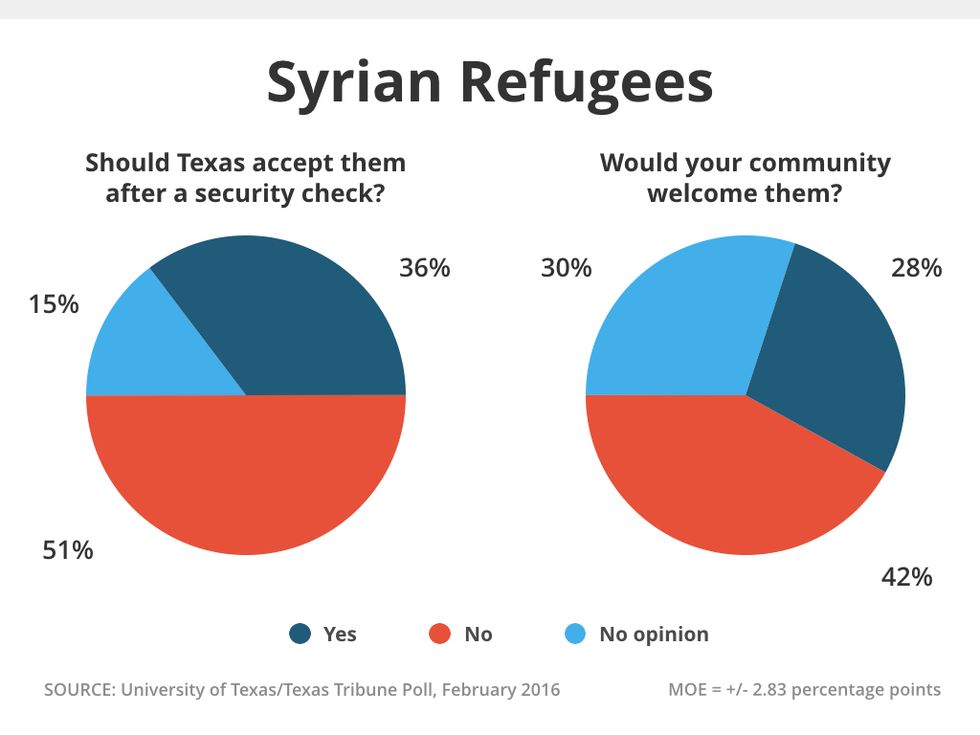 Democrats and Republicans split on that question, with 58 percent of Democrats saying Texas should accept Syrian refugees and 76 percent of Republicans saying the state should not accept them.
