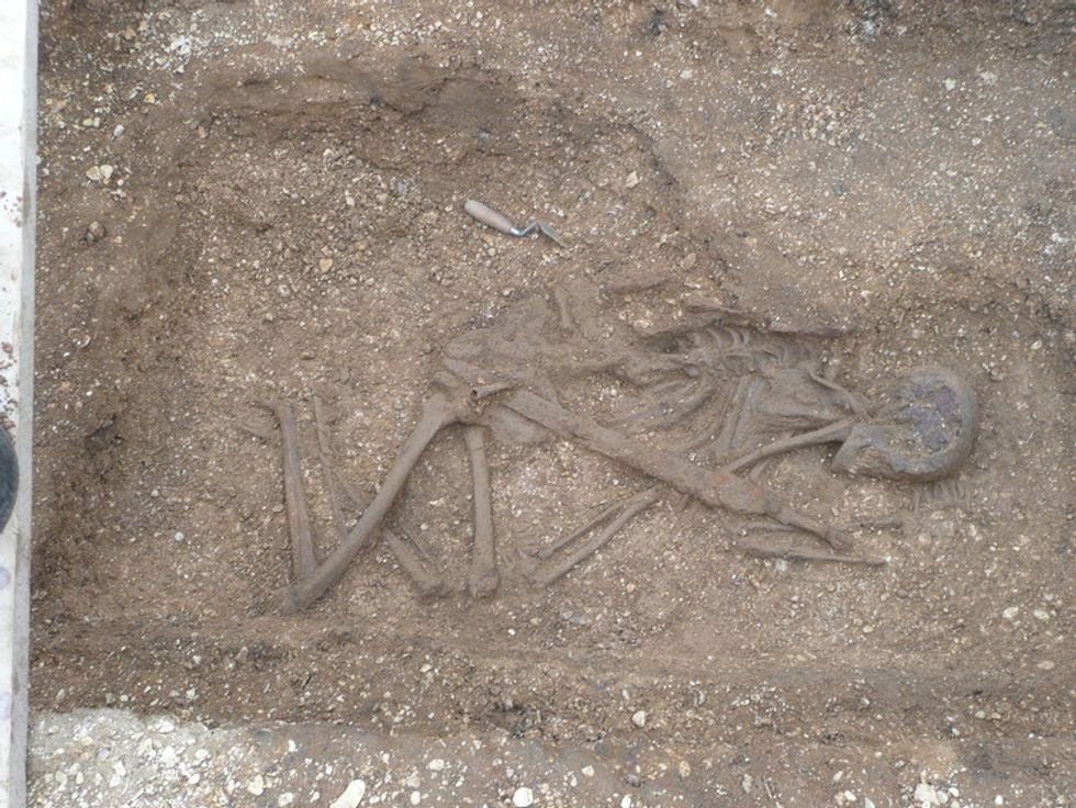 At Pocklington, the most striking of the recent finds is the grave of a young man, probably a warrior, buried with an iron sword between 2,000 and 2,500 years ago. What is remarkable is the presence of five spearheads, whose position shows unequivocally that they had been thrown at the corpse itself. Most of the burials were without grave goods, though one female was buried with a fine brooch similar to examples found on the continent.