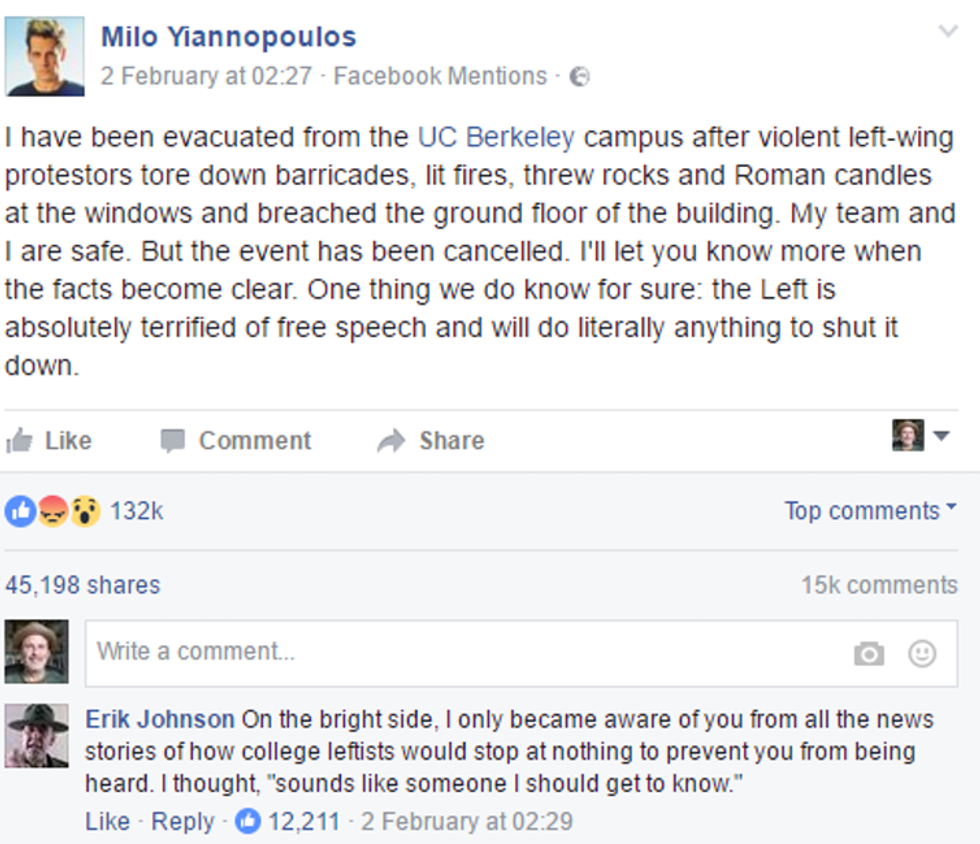 Trump’s tweet has further muddied the waters in America’s ongoing free speech debates. The First Amendment is written into the American DNA – but for many who view free speech as a tool of social awareness and activism, lining up on the same side as Trump and the alt-right seems anathema. I can’t help wondering whether Berkeley’s ragtag fringe of neo-cons plotted Yiannopoloulos’ invitation for no reason but to bask in the outrage that would follow.
