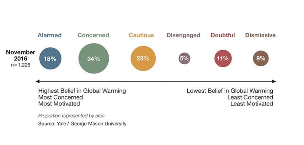 A small and declining number of Americans continue to dismiss the reality and the risks of global warming. Our analysis finds that, currently, 9 percent of Americans have what we characterize as “dismissive” beliefs about the issue. Meanwhile, 18 percent are “alarmed” (i.e., very concerned about the issue) and 34 percent are “concerned” (moderately concerned about the issue).