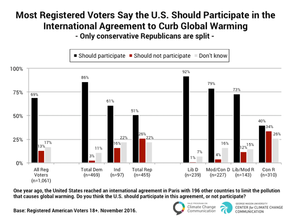 In a nationally representative survey conducted last November after the election, we found that seven in 10 registered voters say the U.S. should participate in the Paris climate agreement. Only 13 percent say the U.S. should not.