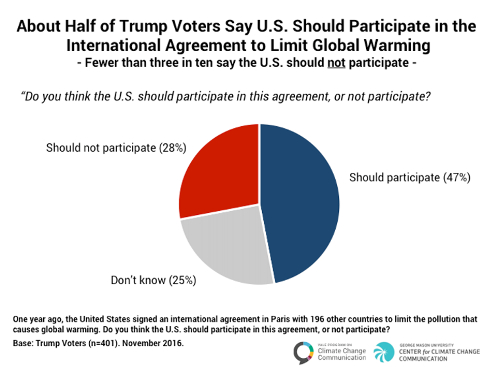 Our research finds that a clear majority of Americans say that global warming is happening, human-caused and a serious threat requiring action. More specifically, there is broad public support for the Paris Agreement – even among Trump voters.