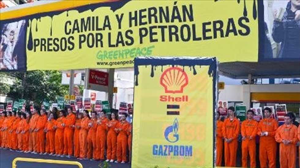 Around 100 protesters staged an action at a Shell gas station in Argentina on Friday, demanding Russia release 30 Greenpeace activists jailed after protesting the oil giant's Arctic drilling operations.
