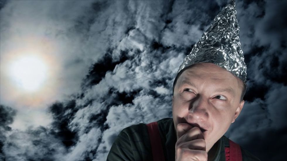 [Image: "Scared Suspecting Man Wearing A Foil Hat Against Dark Stormy Sky" via Shutterstock]