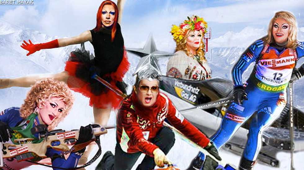 The Mayak cabaret has an exclusive clientele. Its presence is announced by a small, discreet sign and patrons have to ring the bell to be let into the club, which this Saturday was packed with gay, lesbian and a few straight couples. Rainbow flags flutter on the bar, a drag queen in a peroxide wig runs the cloakroom, and the waiters wear leather shoulder pads over naked torsos. On stage, the absurdly camp acts are given an Olympic twist – one drag act is introduced as "gold medallist for blow jobs".