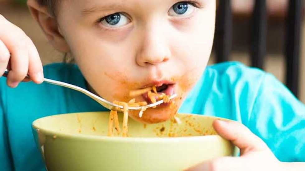 ["Baby eating spaghetti" on Shutterstock]