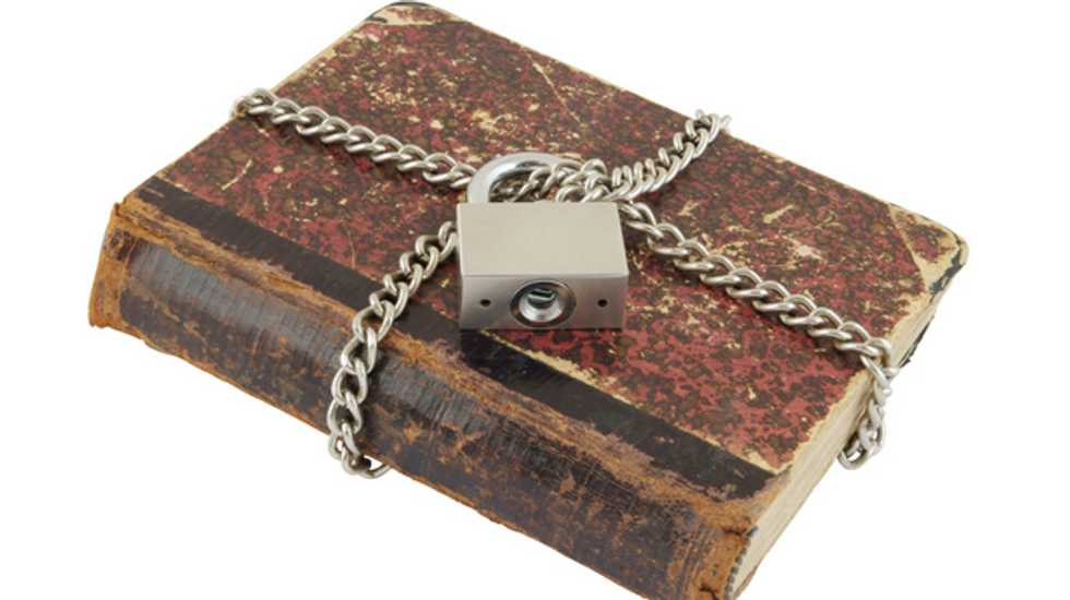 [old book with chain and padlock on Shutterstock]