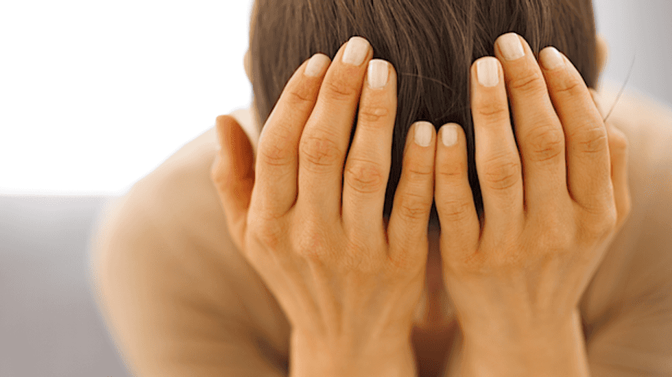 [Image: Stressed young woman sitting on couch via Shutterstock]