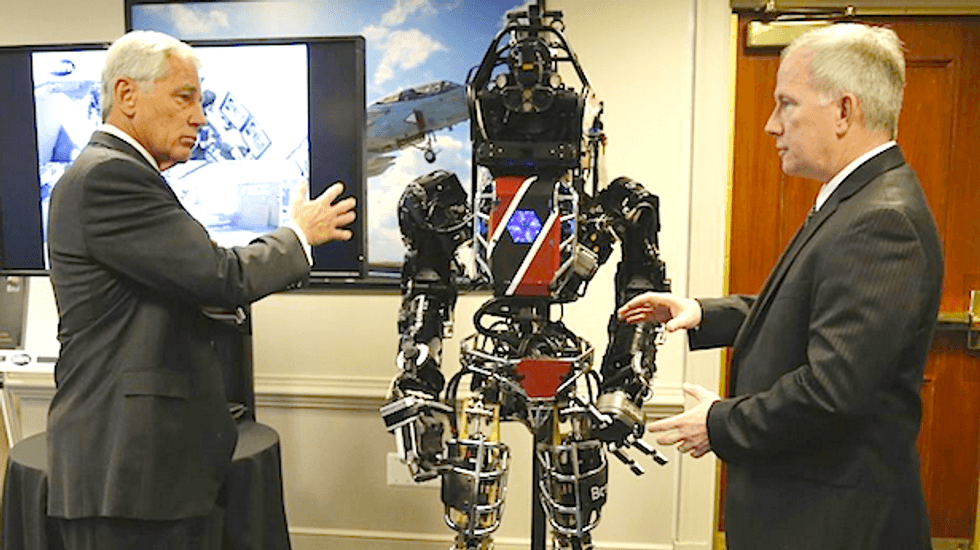U.S. Defense Secretary Chuck Hagel got a first-hand look at a life-size robot that resembles Hollywood's "Terminator," the latest experiment by the Pentagon's hi-tech researchers.