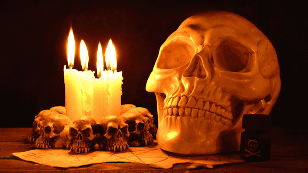 [Image: Creepy human skull with evil candles burning via Shutterstock]