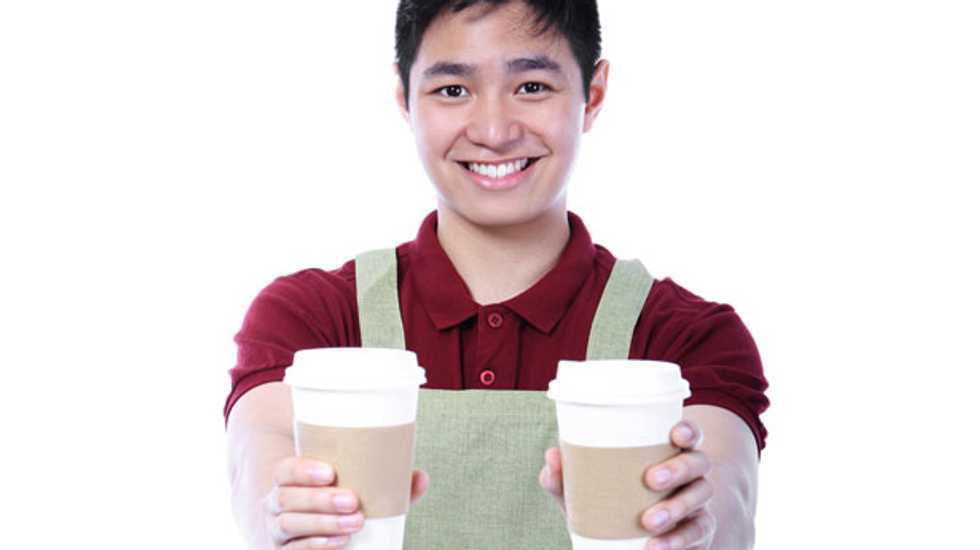 [Image: A teenager holding two disposable cups with blank sleeves via Shutterstock]