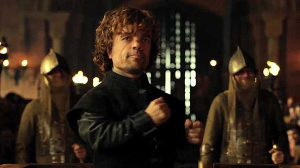 Brothers Tyrion and Jaime Lannister, played by Peter Dinklage and Nikolaj Coster-Waldau, dance down the aisle and implore fellow cast members to clap and sing along to 'Good King Wenceslas' prior to Tyrion's trial where he is sentenced to death.
