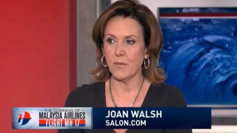 Appearing on MSNBC’s PoliticsNation with host Al Sharpton, Salon columnist Joan Walsh defended President Barack Obama against Senator John McCain's accusation of cowardice in response to the shooting down of flight MH17, bringing up a sore point for McCain: his selection of Sarah Palin as his running mate in 2008.