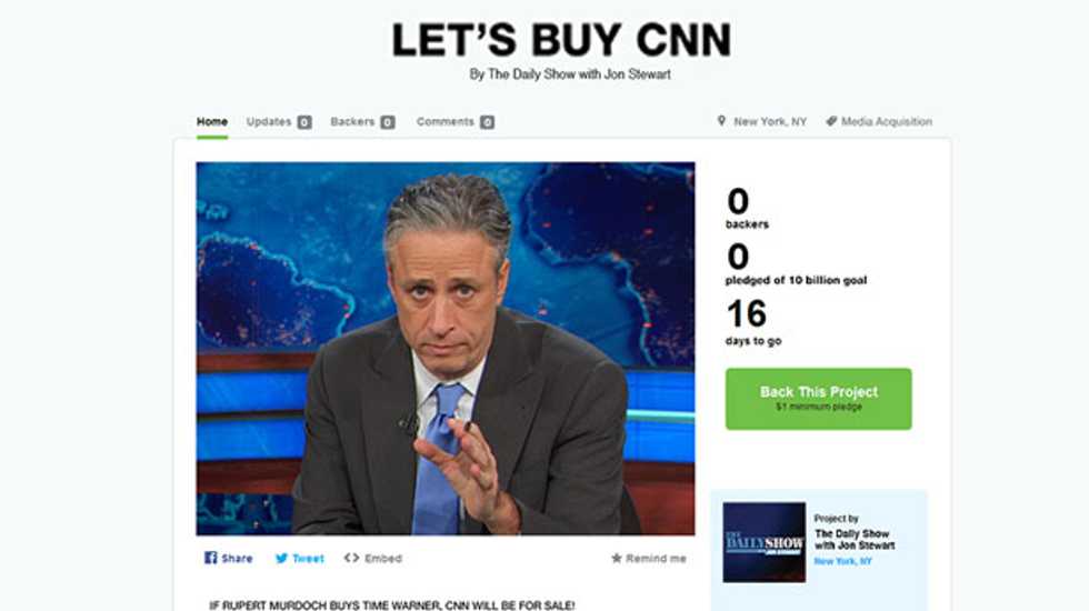 Reacting to news that media mogul Rupert Murdoch is attempting to purchase media conglomerate Time Warner, and would then be forced to divest himself of its CNN subsidiary, Daily Show host Jon Stewart announced the launch of a Kickstarter campaign to purchase the much-mocked news network