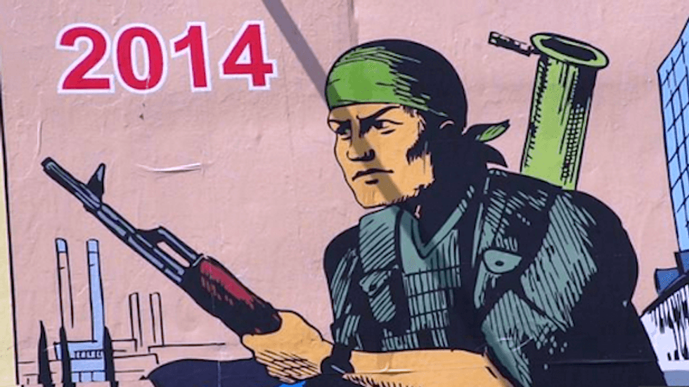 Another depicts a Soviet Red Guard fighter in the Civil War with the date 1918, followed by an image of a Red Army soldier with the date 1941, then a modern-day rebel fighter with a surface-to-air missile and the date -- 2014.