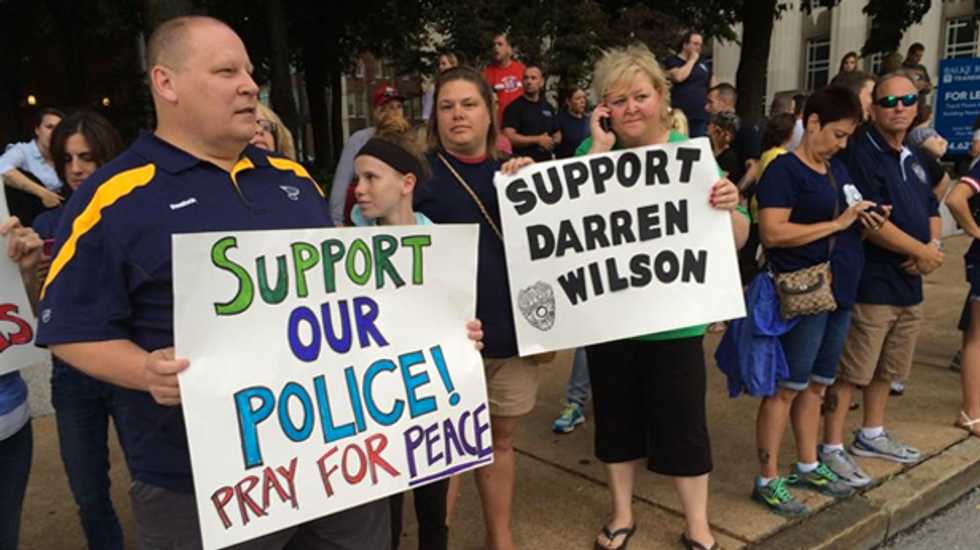 In stark contrast to the highly militarized police presence at rallies and protests for Michael Brown in Ferguson, the Wilson rally drew only 11 police officers, with five of them on bicycles.
