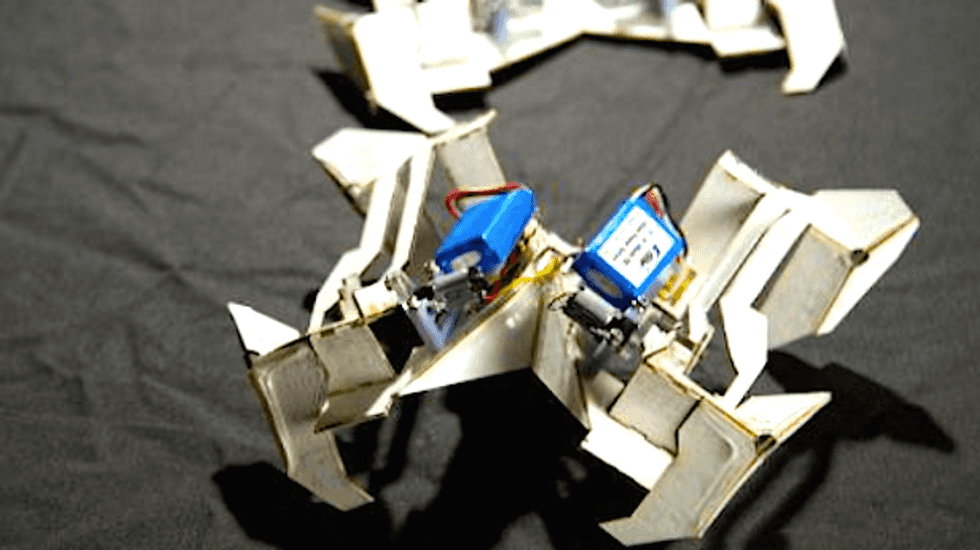 It starts out laying flat, like a sheet of paper. Then it springs up, almost lifelike, and folds into moveable parts much like origami art. And then it crawls away.