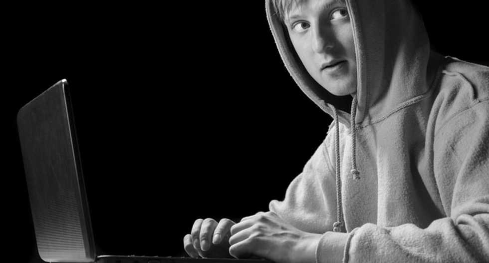 [Young man with laptop is looking back on Shutterstock]