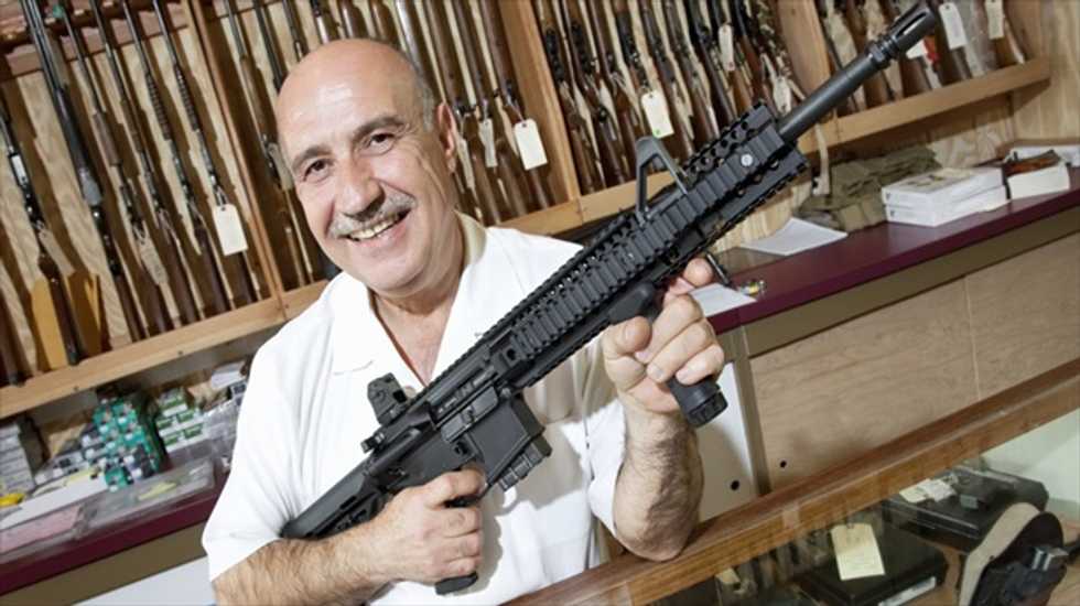 ['A Happy Middle-Aged Merchant With Rifle In Gun Shop' on Shutterstock]