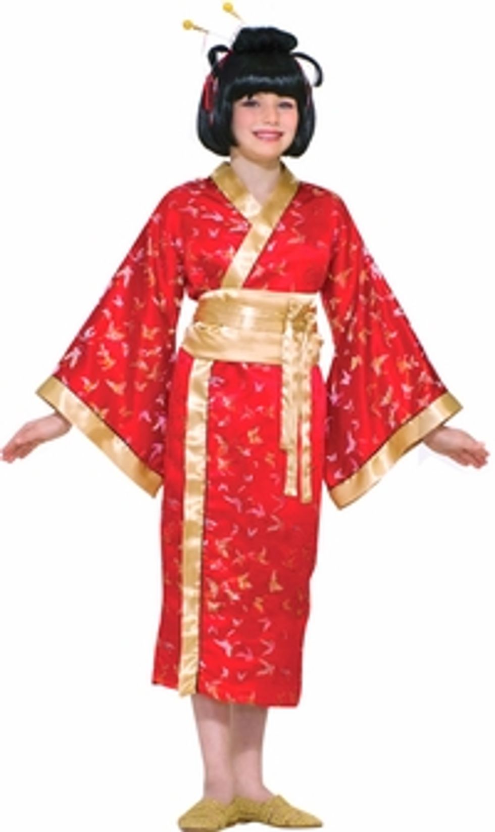 I love how "Asian inspired" the whole look is. I also really appreciate how careful they are to, once again, include people of all backgrounds and ages. This particular costume is for preteens and teens, and is available, as you can see in sizes 0-4. The skirt length is authentic (to something, though I don't know what) and a great way for your teen or preteen to keep cool while running around oblivious to cultural appropriation and trick-or-treating.