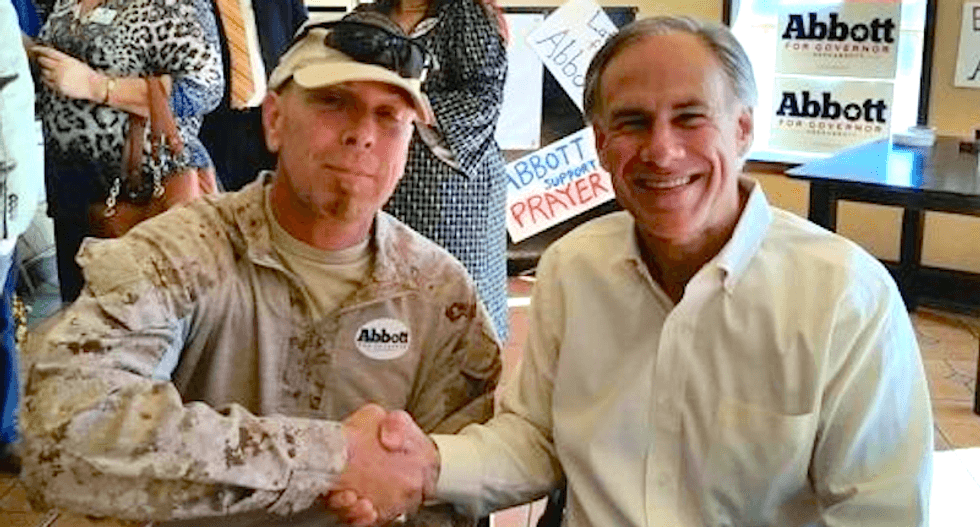 Massey is wearing an “Abbott for Governor” sticker on his camouflage fatigues in the photos and shaking hands with the smiling Republican candidate, the newspaper reported.