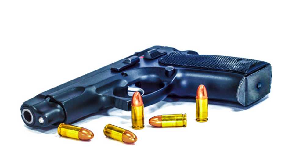 Pistol and bullets on white background via Shutterstock.com