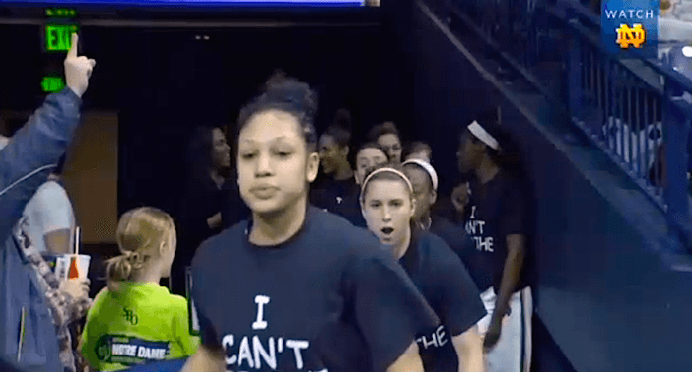 “It wasn’t anti-law enforcement, anti-anything message,” said Notre Dame player Tara Reimer, who urged her teammates to join the protest. “It’s just showing condolence for the family and supporting them.”