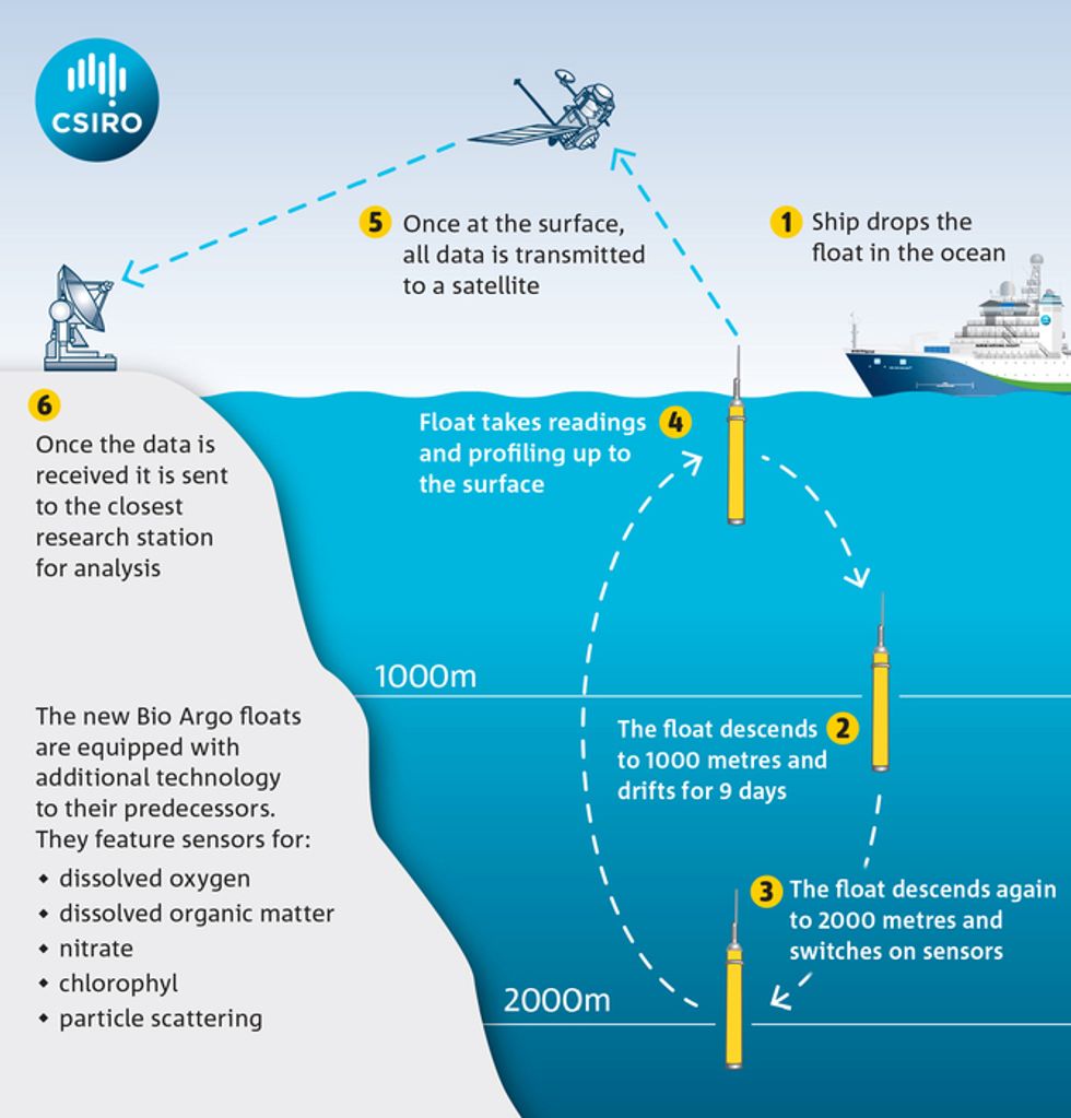 Argo floats measure temperature and salinity. Bio-Argo floats with other sensors are also being tested by CSIRO