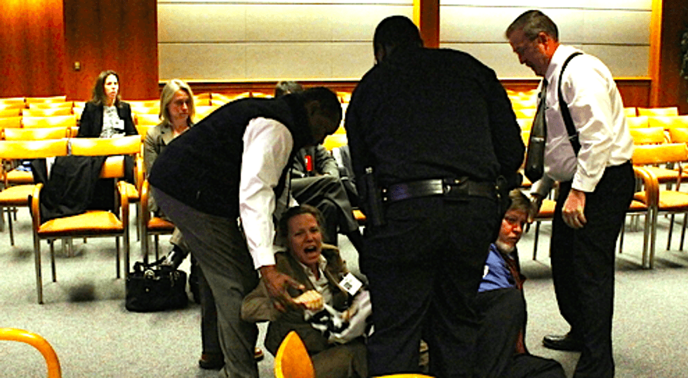 Internet activists Margaret Flowers and Kevin Zeese, of Popular Resistance, were dragged from the room by security after interrupting Pai’s comments.