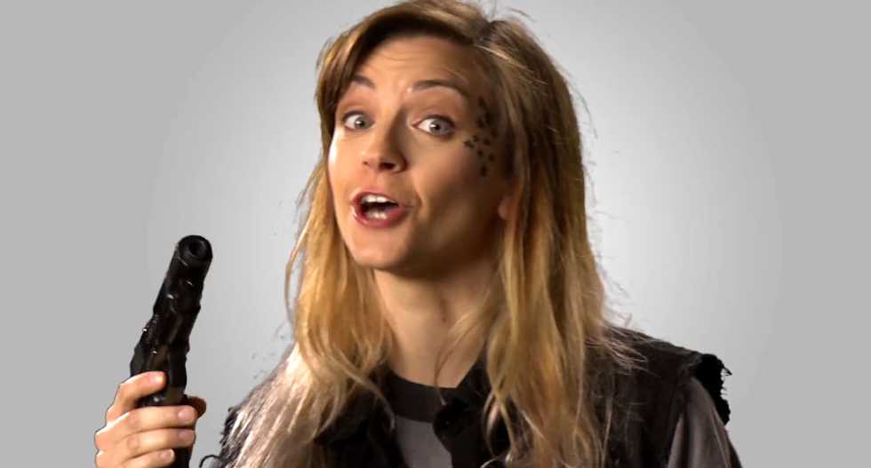 The Funny or Die video opens with a young woman and a young man facing the camera, dressed in black, sporting tattoos and powerful handguns.