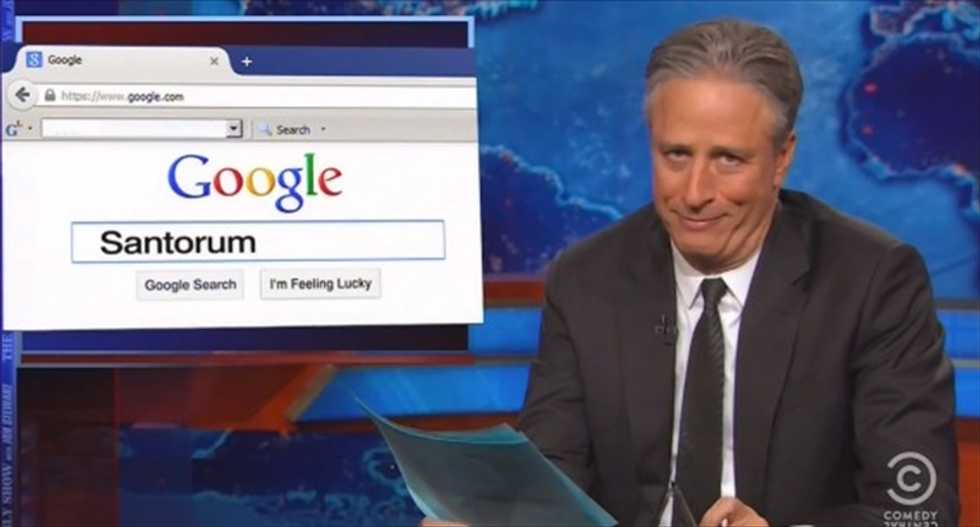 "I know you don't want to redefine the word 'marriage,' but it does appear you want to redefine the words 'love' and 'support,'" Stewart joked. "Santorum doesn't want to attend the wedding, that's fine; he'll be there on the wedding night."