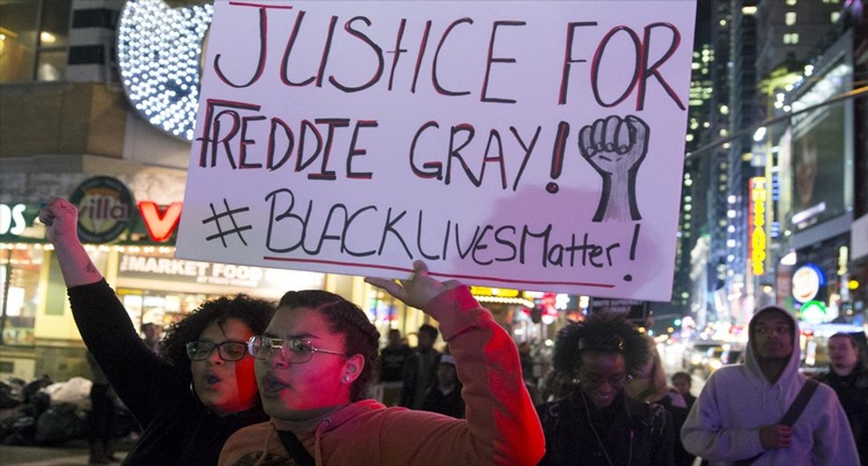 Protesters march near Times Square in the Manhattan borough of New York City, calling for social, economic, and racial justice on April 29, 2015. Photo by Mike Segar for Reuters.