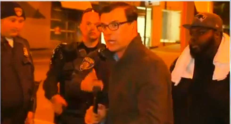 CNN’s Miguel Marquez was attempting to interview protesters, asking "Why are you doing this?" when a phalanx of police officers came between the reporter and his cameraman.