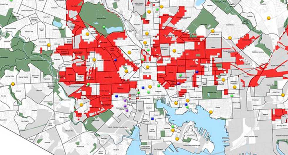 Red areas indicate ‘food deserts’ in Baltimore, areas where the distance to a supermarket is more than a quarter mile and the median income is below the poverty level and other factors.