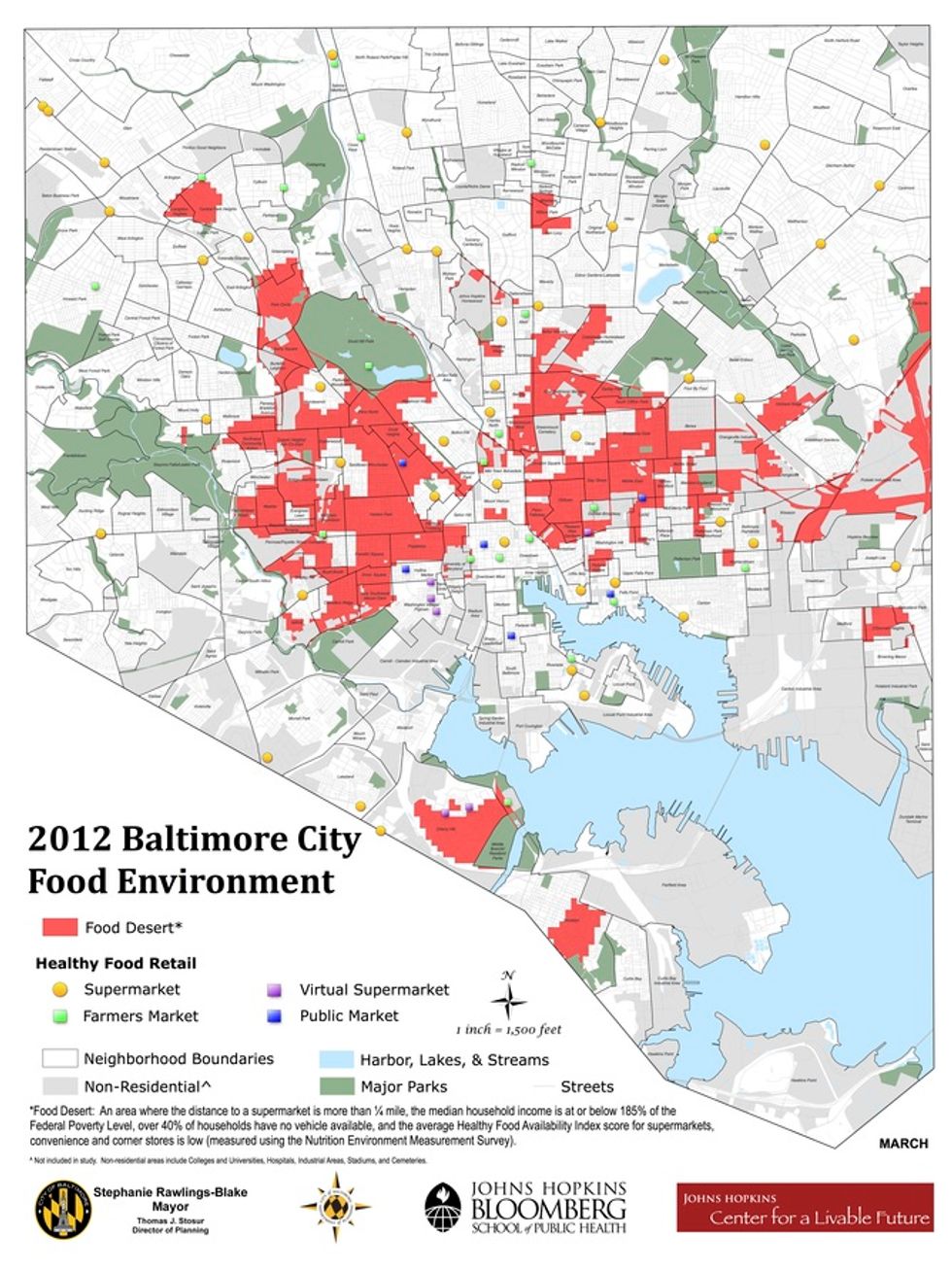 Freddie Gray serves as an example of the issue of food deserts as well; he lived in a community with limited access to fresh food (see the map here from Johns Hopkins Bloomberg School of Public Health), as do one in five residents of Baltimore City and one in four school-aged children in Baltimore.