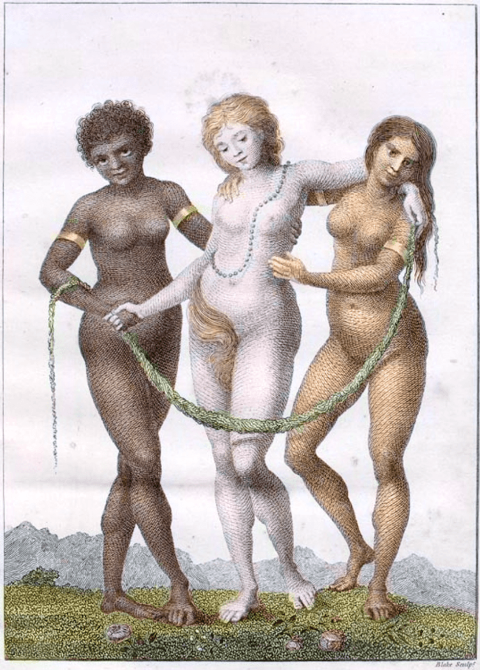 In art, too, nations are often portrayed as women, such as in English painter William Blake’s engraving, “Europe supported by Africa and America” (1796) of three naked women – one black, one white, one brown – who stand in for their countries. These white male colonialists hardly differentiated between what could be extracted from the land and their right to extract whatever they wanted from native women.