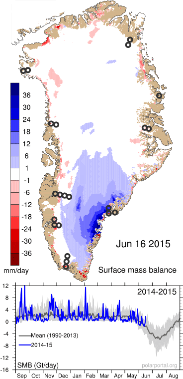 Daily surface mass balance estimates of the Greenland ice sheet. Red indicates losses. Credit: Polar Portal[/caption]