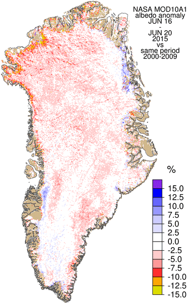 In addition to warmer than normal temperatures, Greenland’s ice sheet has been getting steadily darker. This year currently ranks as the third-darkest on record for early July.