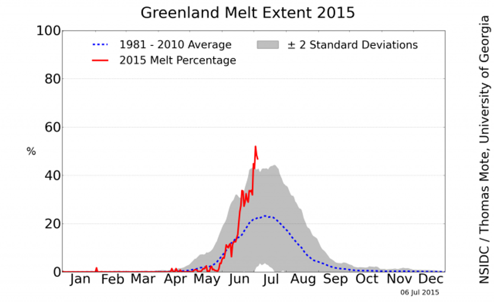 Greenland melt extent. Credit: NSIDC[/caption]