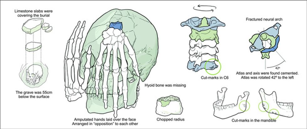 The decapitation is reminiscent of Neolithic skull cults from the Middle East, which often buried their deceased under the floors of their homes – sometimes with the skull removed, plastered and painted. The placement of the hands is also similar to partial coverage of face gestures that we see in different cultural settings today (such as signs of tiredness, shock, horror etc).