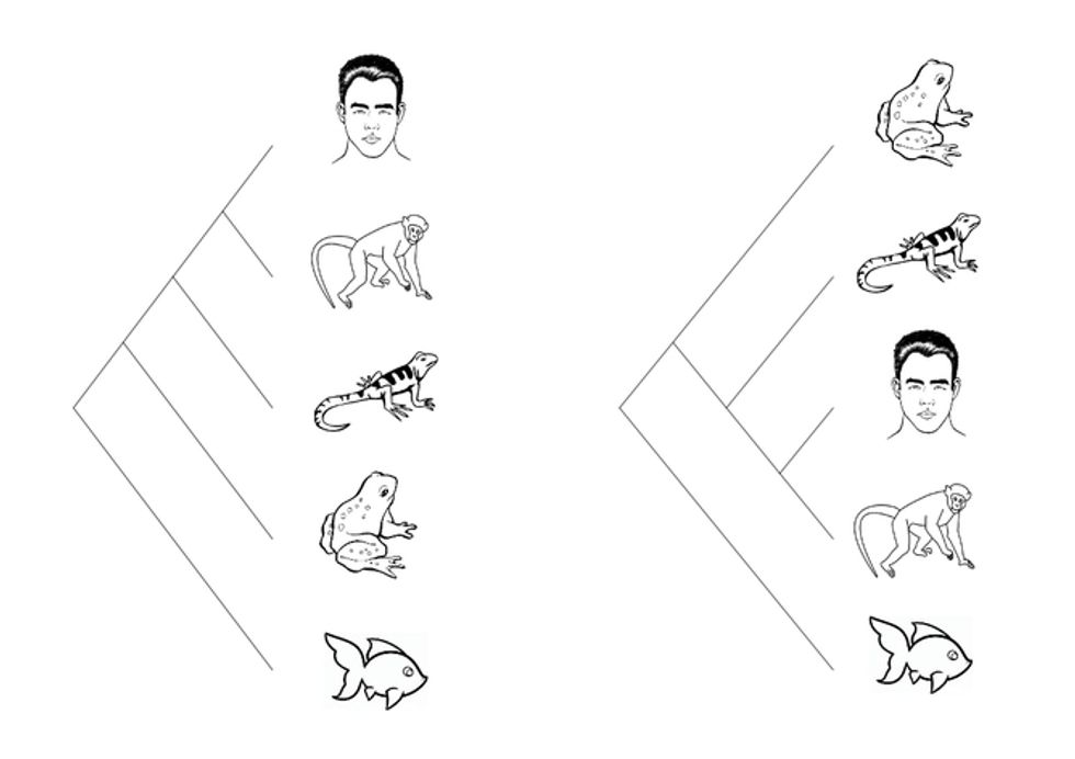 Both are correct and show exactly the same information about the relationships – humans are more closely related to monkeys than both are related to lizards than all are related to frogs, and so on. But we know people are not a link between fish and frogs in any meaningful sense. Any of the nodes in a family tree can be rotated without changing the correct relationships among the present-day members – the rotation on the left is the usual one just because we like to be on top!