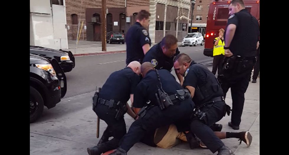 Video shows nine police California officers arrested a black teenager and slammed him on to concrete while arresting him for jaywalking.
