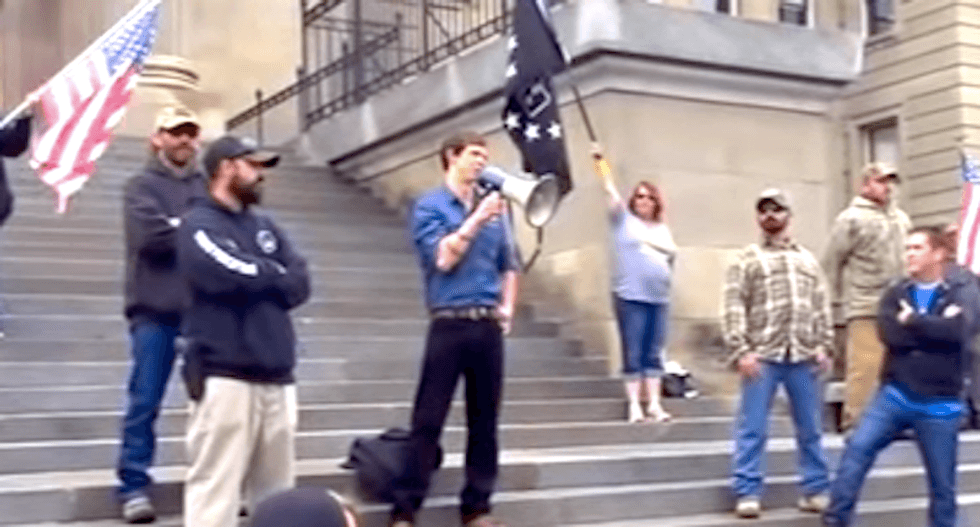 “This isn’t some made-up crap we’re spewing out here, like they’re leading you to believe across the way," shouted Brandon Curtiss, president of the right-wing group.