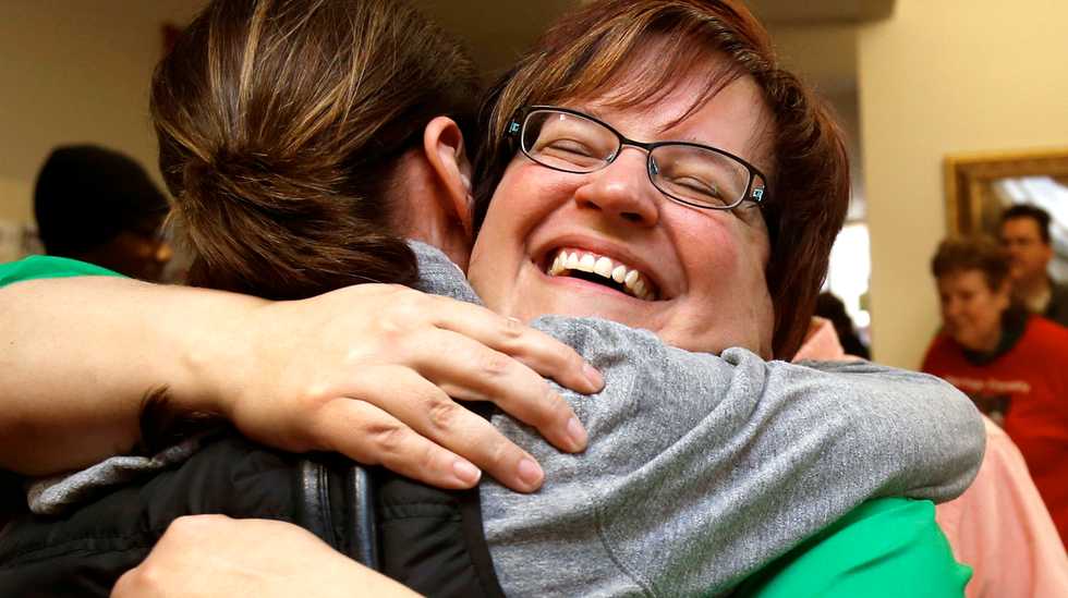 Plaintiff April Deboer celebrates with a supporter at the Affirmations Center after a Michigan federal judge ruled that a ban on same-sex marriage violates the U.S. Constitution and must be overturned, in Ferndale, Michigan March 21, 2014