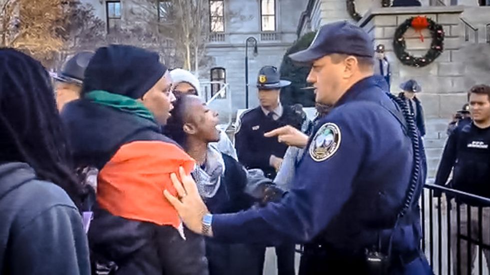 A a black counter-protester was arrested at a secessionist rally over the weekend after the event was recently reinstated by South Carolina Gov. Nikki Haley (R).