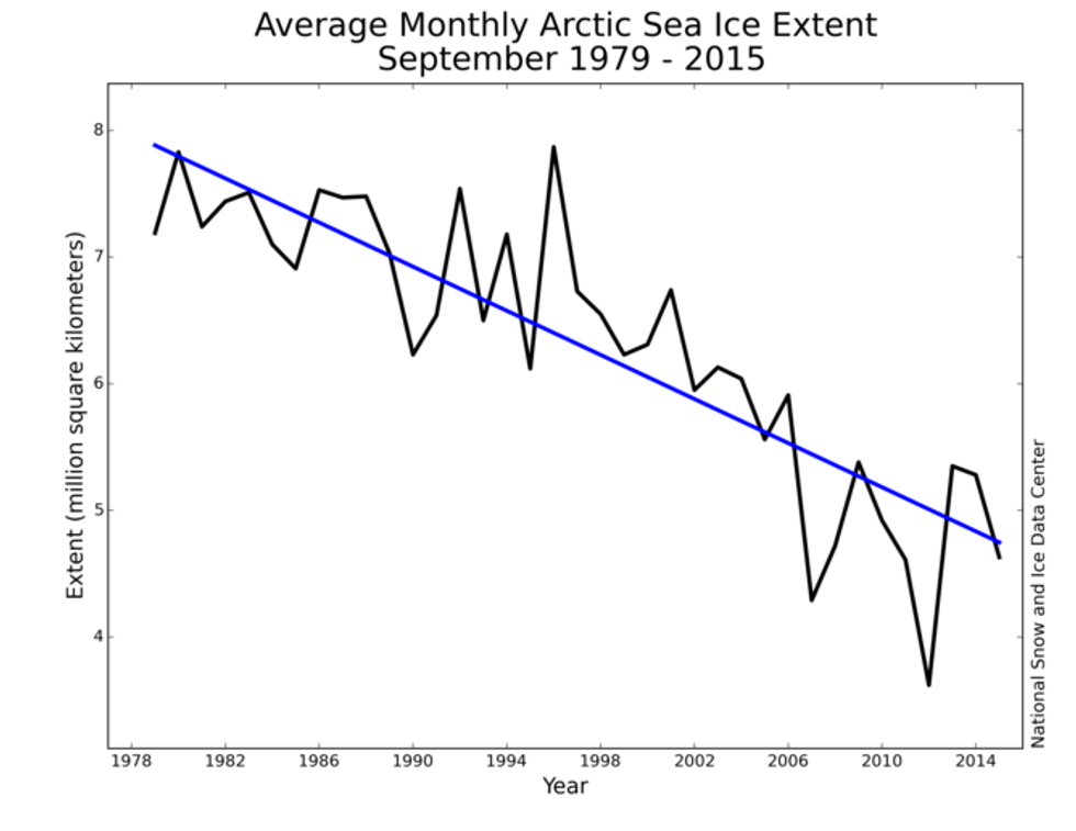 Observations of September Arctic sea-ice extent over the period 1979 to 2015 show a 13.4% reduction per decade relative to the 1981-2010 average.