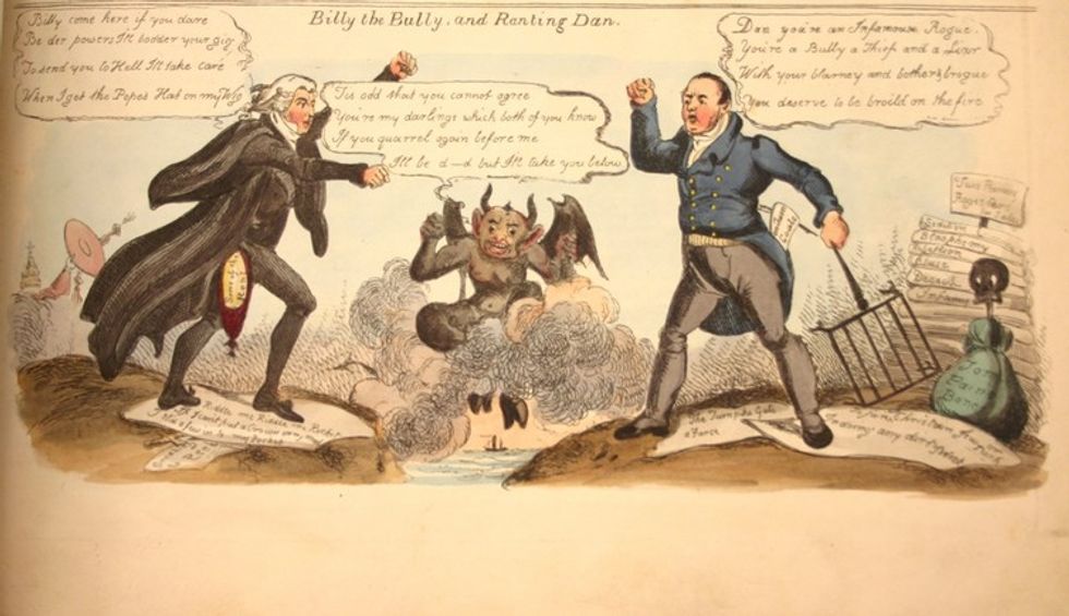 The Looking Glass contained the world’s first comic strip, namely the History of a Coat, whose adventures from owner to owner ran over three episodes. There were many examples of speech bubbles, such as the heated one below between “Billy the Bully and Ranting Dan”.
