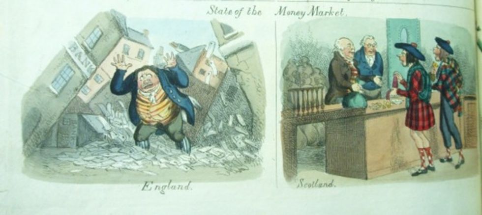 Well before the environmental movement as we know it was a cartoon entitled: “The Consumption of Smoke”, which gives a futuristic before-and-after imagining of city life without factory smoke. Also eye-catching is the hard-hitting cartoon in the lead image that accompanied an essay on the problem of grave robbing; and the one below that depicts English banks crumbling around a fat John Bull next to thrifty Scotsmen – ironic after the banking crisis in our era.