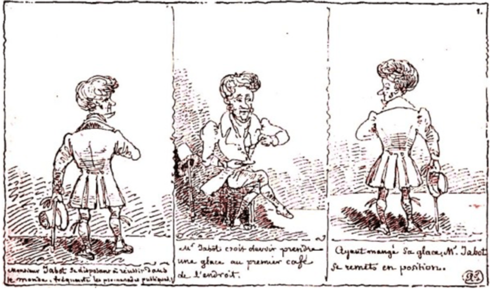 Despite being a trailblazer, the Looking Glass’s claim to be the world’s first comic was overlooked by virtually all historians of the graphic novel until the end of the 20th century. The main previous contender was the Histoire de M. Jabot, which was launched in 1835 by Geneva schoolmaster Rodolphe Töpffer. Jabot tells the story of its central character’s search for love. The tone is burlesque and caricatural, with humour often provoked by the discordance between the pseudo-lofty tone of the text and the slapstick nature of the accompanying images.