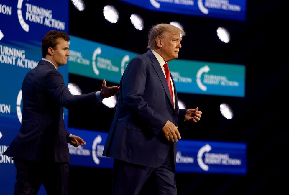 Former President Donald Trump walks on stage after being introduced by Charlie Kirk (L) at the Turning Point Action conference as he continues his 2024 presidential campaign on July 15, 2023, in West Palm Beach, Fla. Trump spoke at the event held in the Palm Beach County Convention Center. (Photo by Joe Raedle/Getty Images)